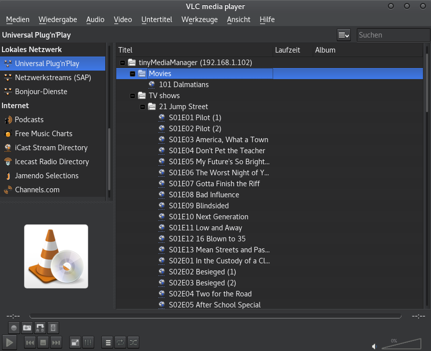 This feature exposes your library to all UPnP aware devices in your LAN. You can browse your complete tinyMediaManager library, and play all videos. Either from Kodi, a tablet, your smartphone, a Smart-TV… anything which has an UPnP feature, and understands this type/codec/format of video, should be usable.